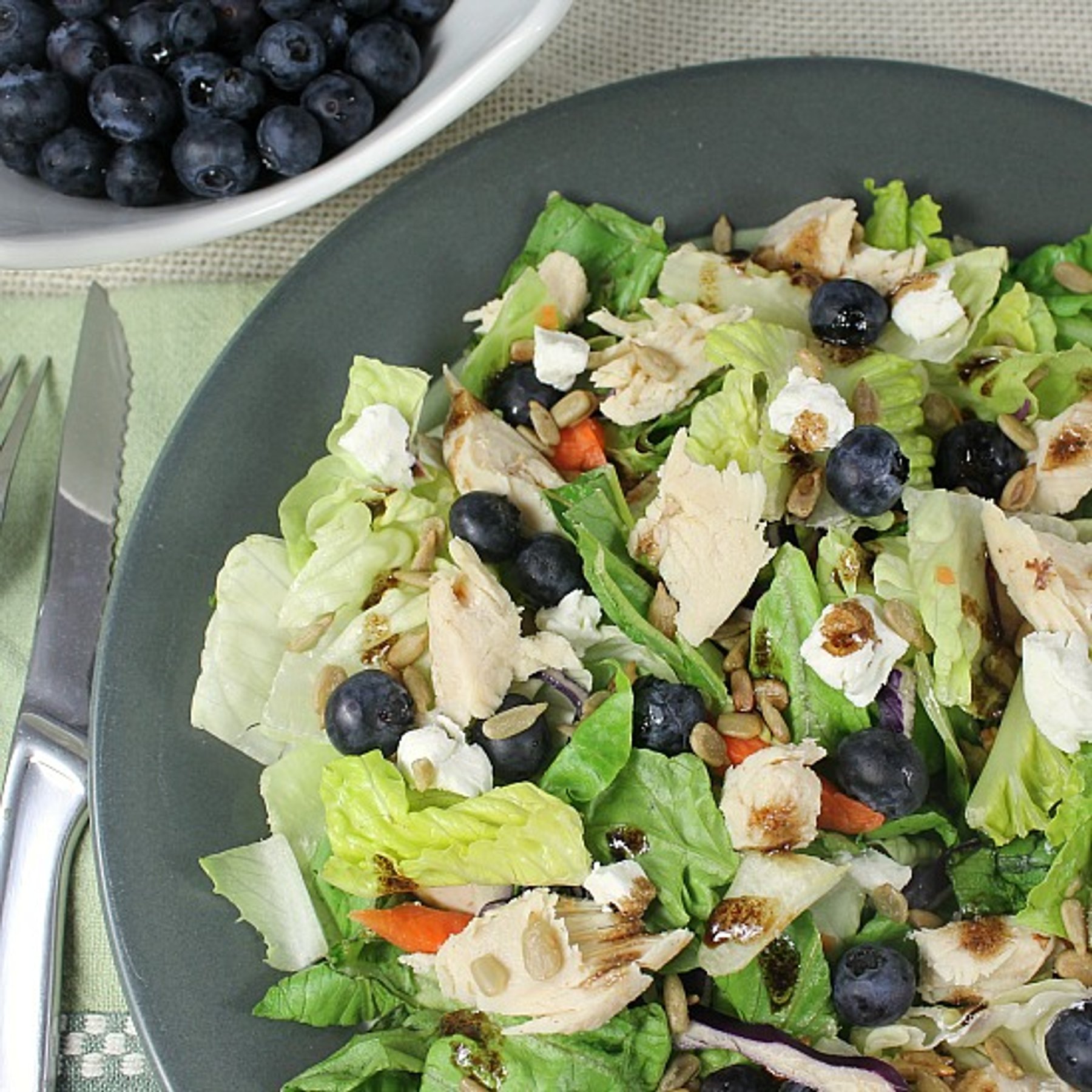 Top with chicken, goat cheese, sunflower seeds and blueberries.