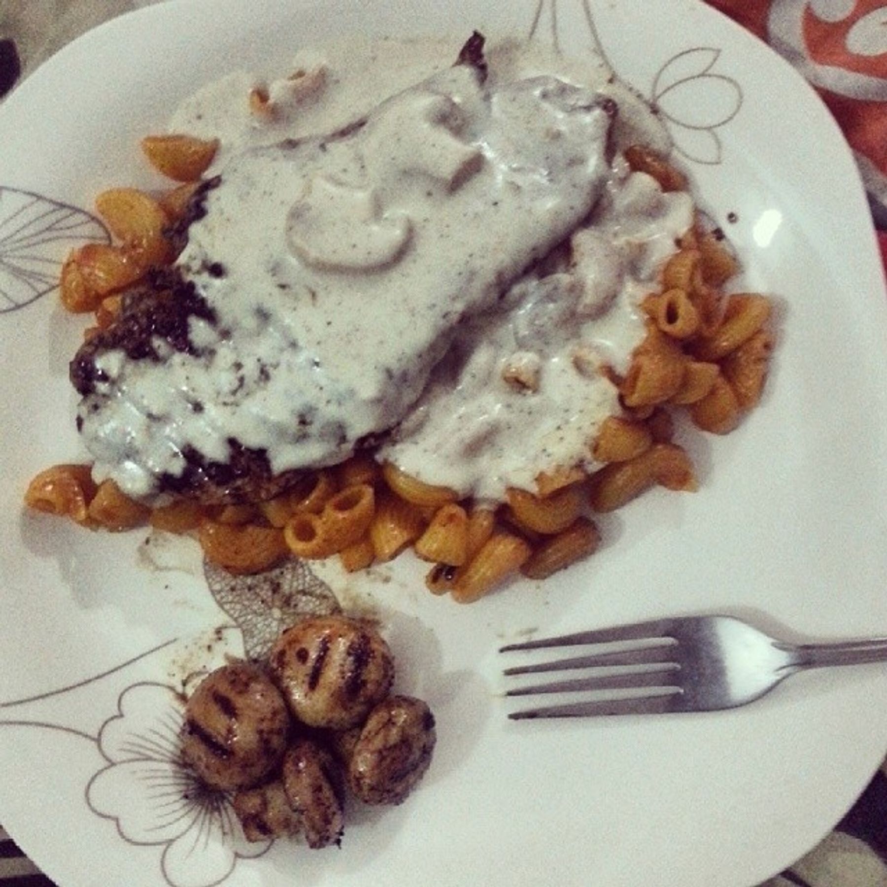 Take a single person serving dish and add generous amount of pasta on it. Gently place your grilled chicken breast on the bed of pasta. Pour your mushroom sauce on the chicken breast. Your yummy healthy chicken with pasta is ready to serve.
