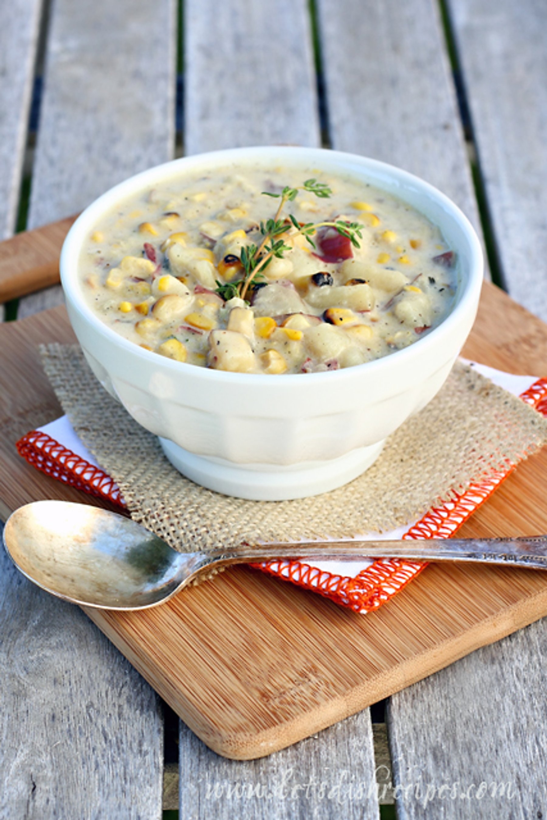 Thick and creamy chowder with chunks of potatoes and sweet grilled corn.