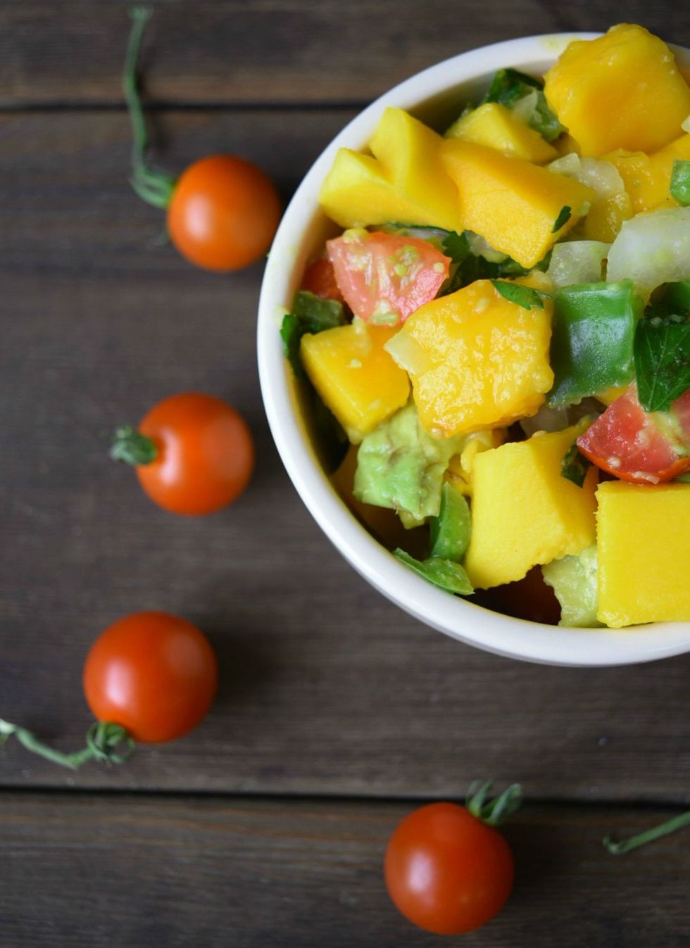 Juicy grilled mango, fresh peaches, peppery cilantro, crunchy onion and pepper, along with cherry tomatoes and avocado is what makes this grilled mango peach salsa a summer BBQ success !