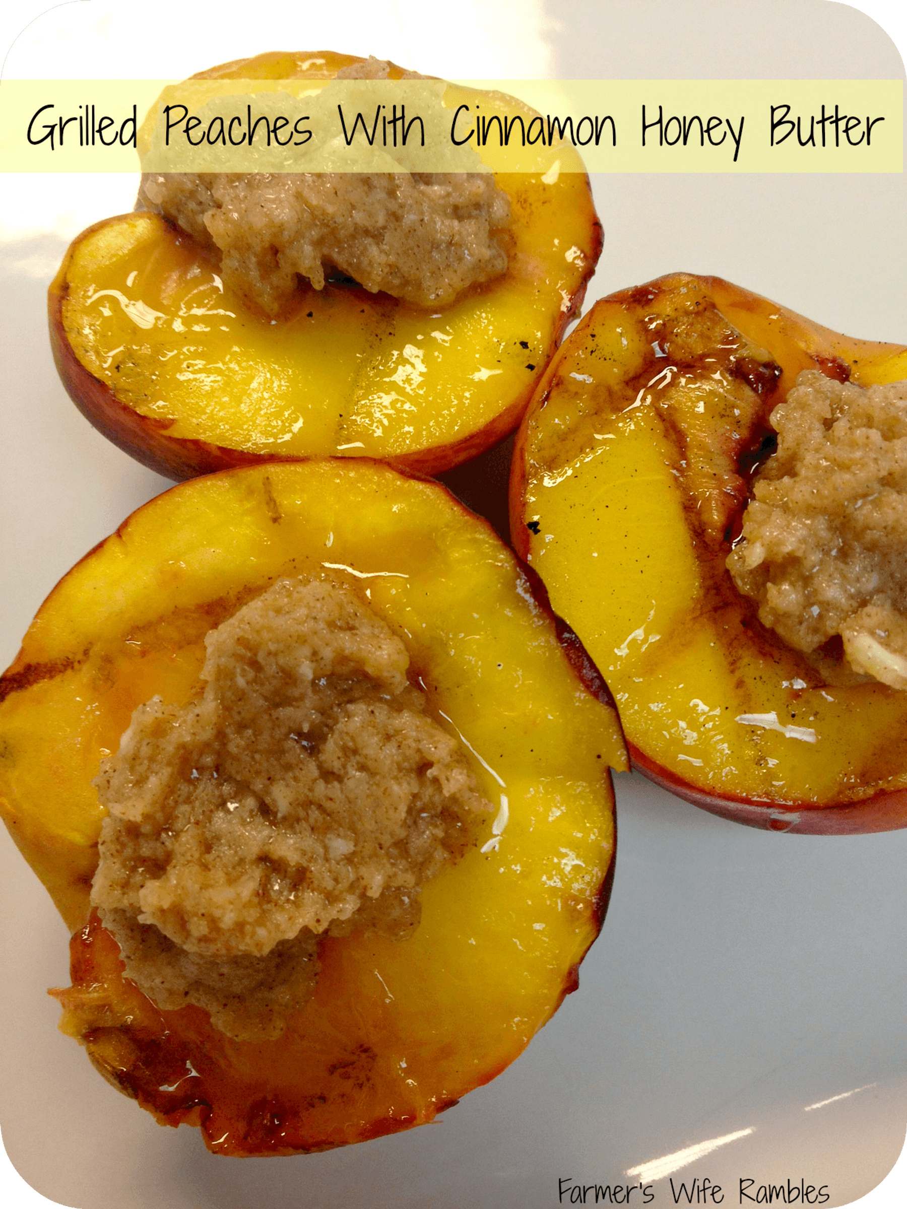The combination of cinnamon honey butter served warm with a grilled peach is delectable and keeps the kitchen cool while having a yummy healthy dessert.