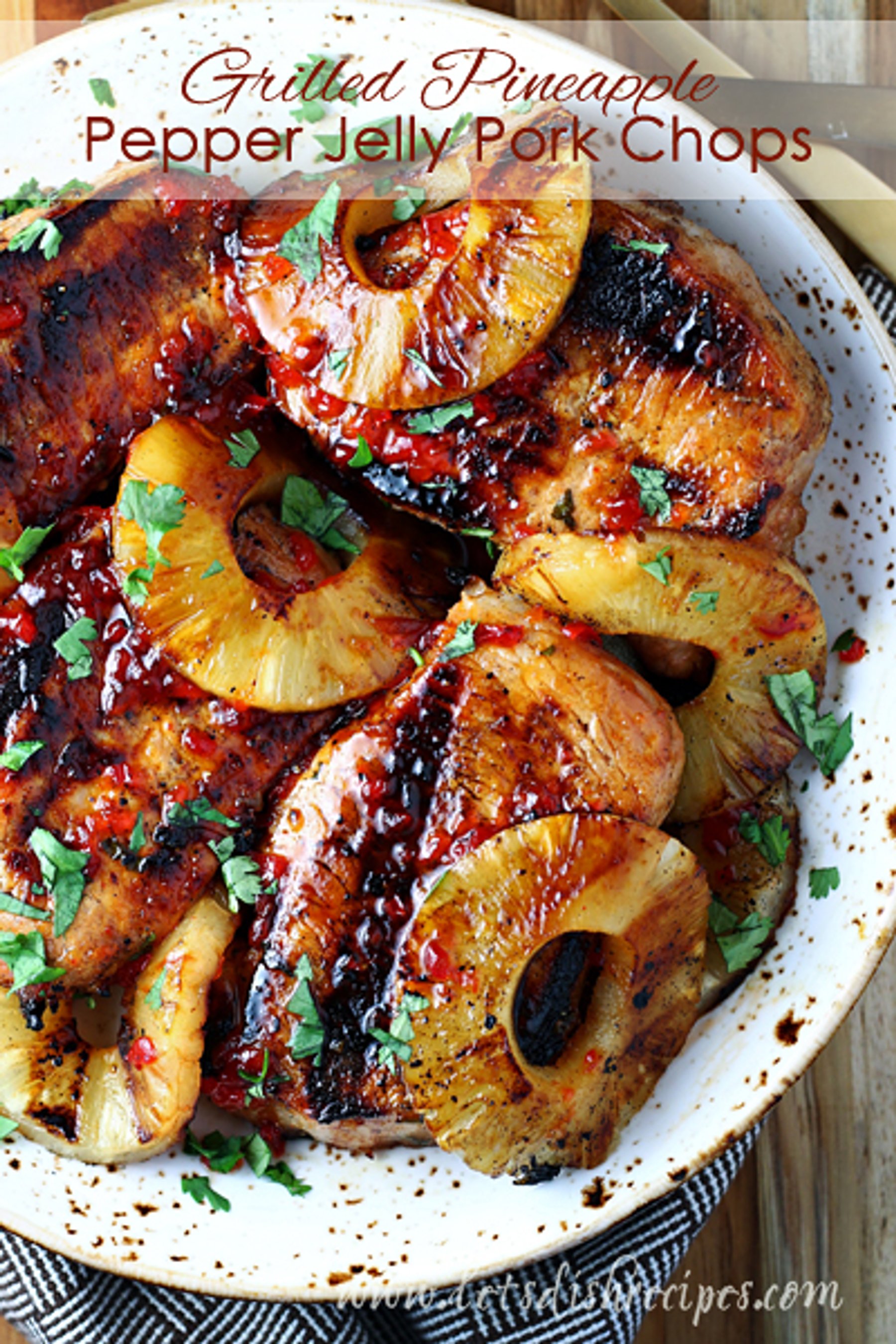 Pork chops are marinaded in a pineapple and pepper jelly mixture, then grilled and served alongside grilled pineapple in this delicious dinner dish!