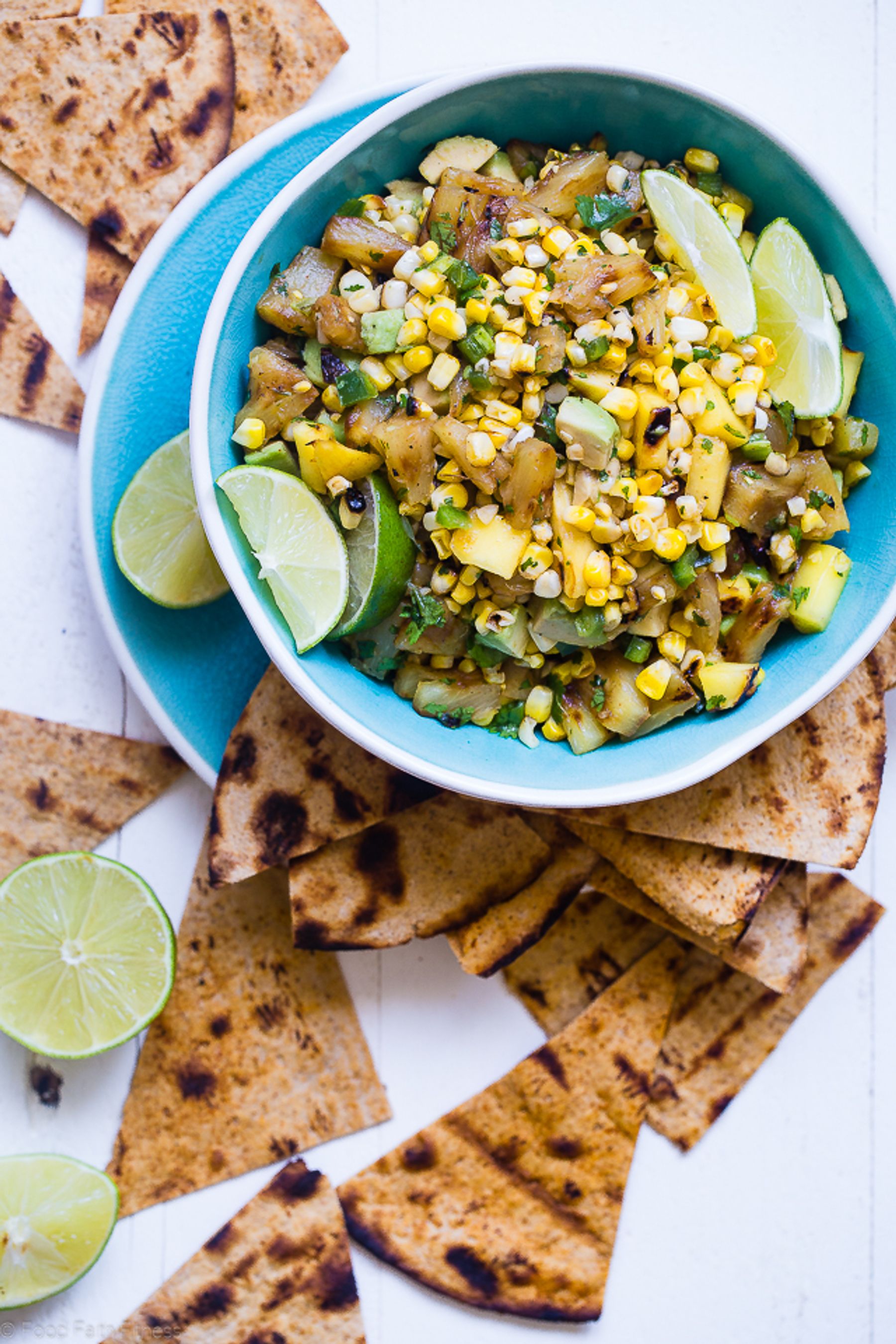 This quick and easy grilled pineapple salsa is mixed with mango, corn and a honey lime vinaigrette for an a healthy, gluten free summer appetizer or dinner!