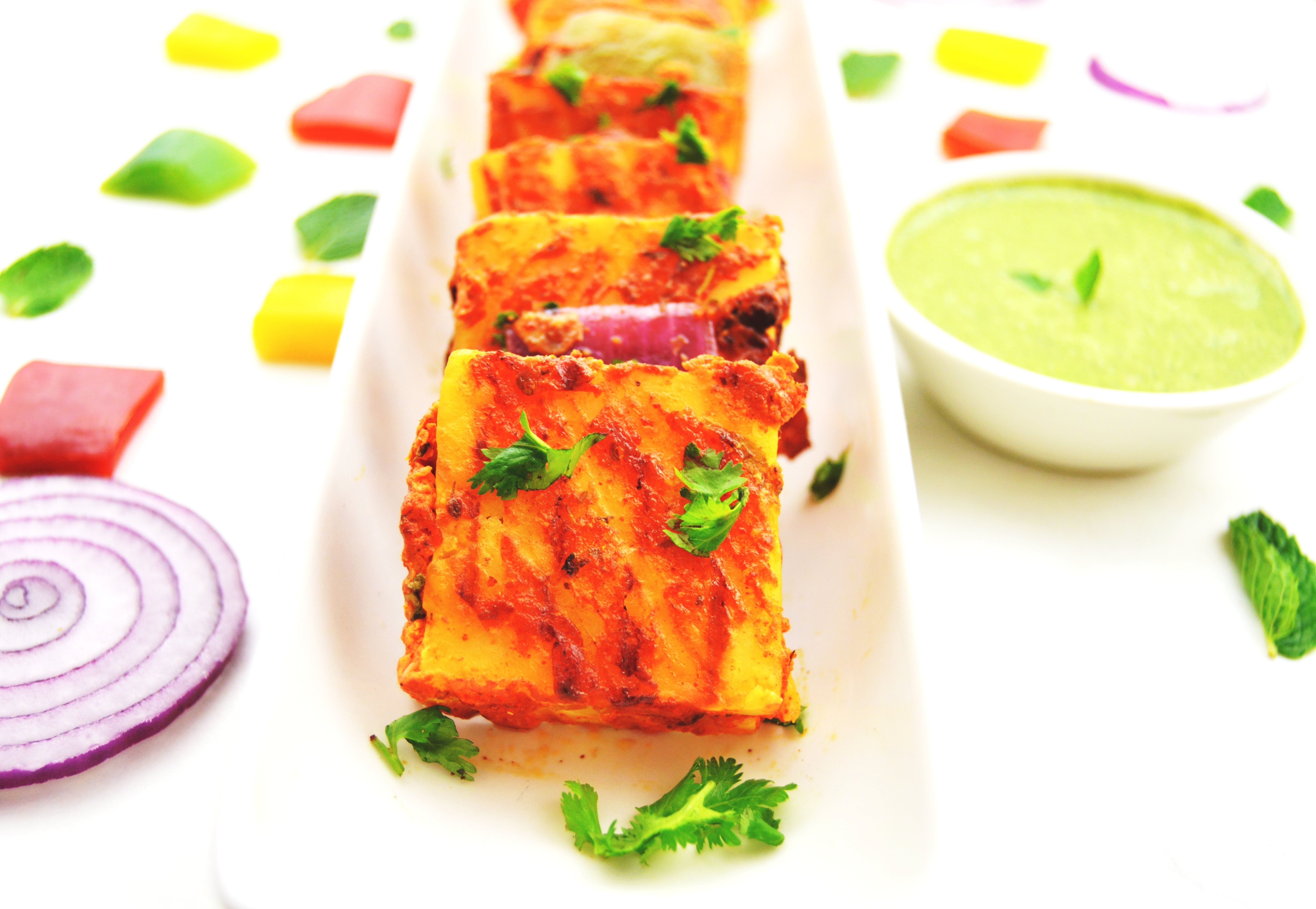 Cubes of paneer (cottage cheese) stuffed with pineapple mixture, marinated in spiced yogurt mix along with cubes of mixed peppers, onions and cherry tomatos, skewered and grilled till brown.