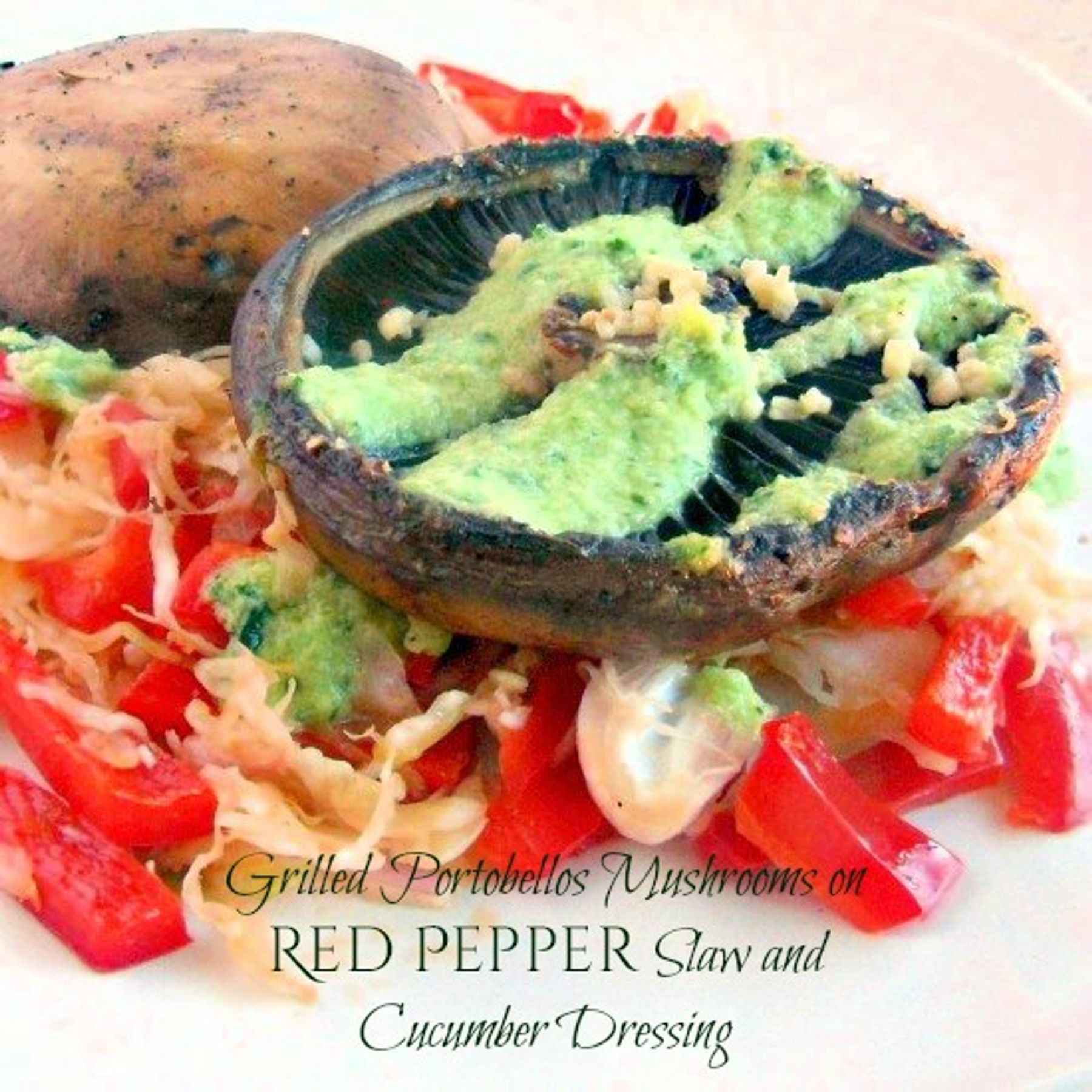 Grilled Portobello Mushrooms On Red Pepper Slaw and Cucumber Dressing