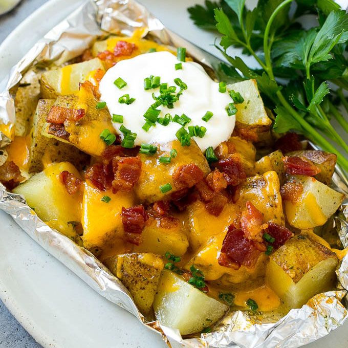 These grilled potatoes in foil are diced potatoes cooked in ranch butter, then topped with melted cheese, bacon, sour cream and chives. All the flavors of a loaded baked potato in foil packet form!