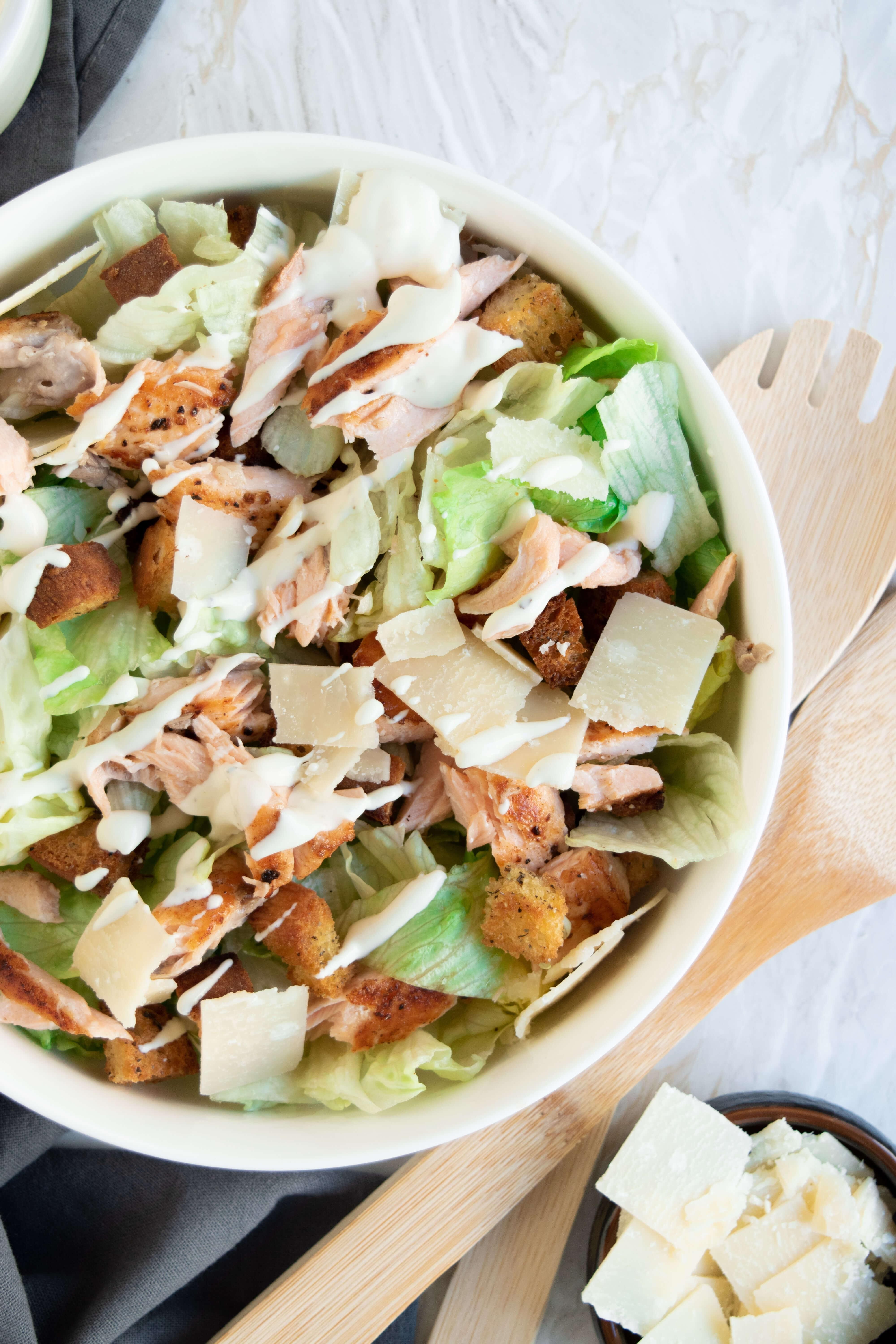 This easy Grilled Salmon Caesar Salad is the perfect healthy lunch that is both delicious and fulfilling! If you love caesar style salads then this is the salad for you, with crunchy croutons, flaky pan-seared salmon, fresh iceberg lettuce, slices of parmesan cheese and a killer caesar dressing!