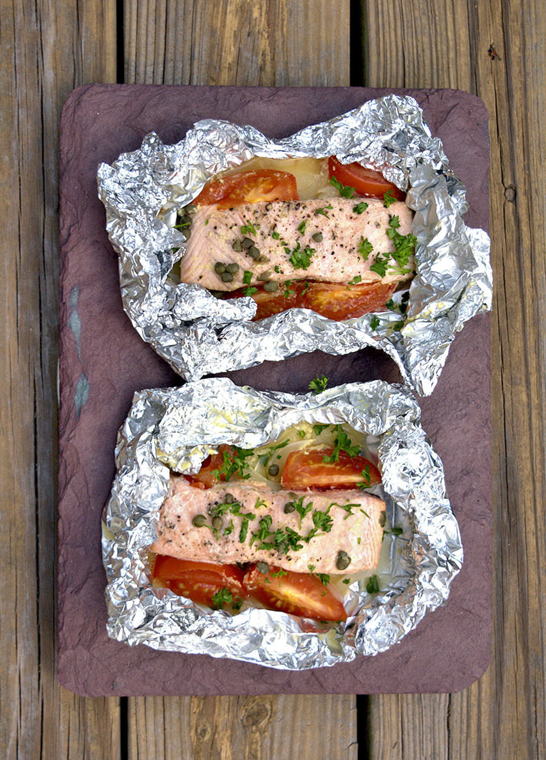 1. Place 2 pieces of aluminum foil on a flat surface, large enough to fold over the fish and seal. Use 2 layers for normal aluminum foil or 1 layer for heavy duty foil.