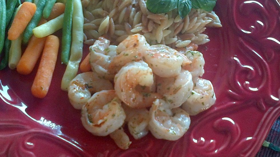 Preheat grill to medium -high. Thread the shrimp onto the skewers and grill 3- 4 minutes each side basting with reserved marinade.
