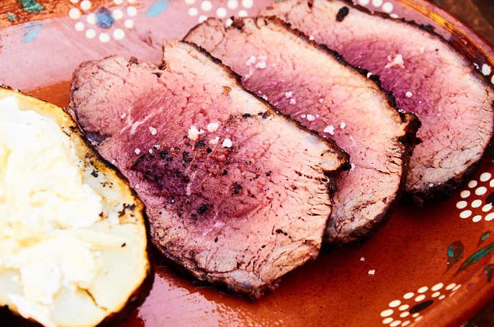 Sirloin cap roast recipe prepared by wrapping the meat with beer soaked, salt encrusted kitchen towels and then slow cooking directly on hot charcoal.