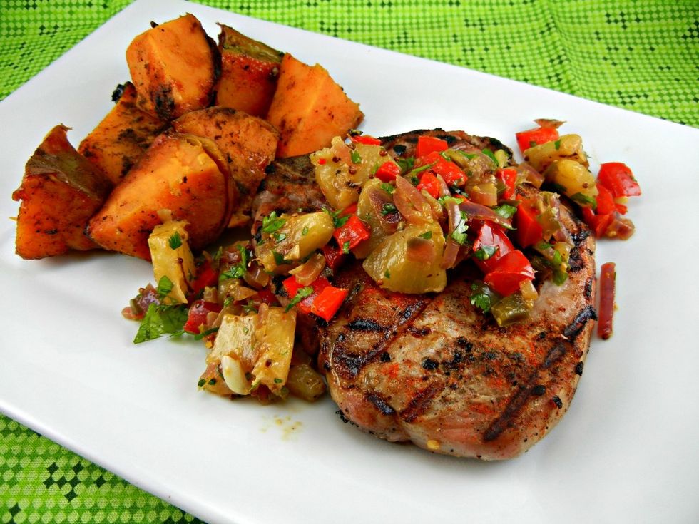 Grilled Spicy Pork Chops with Pineapple Relish & Sweet Potatoes