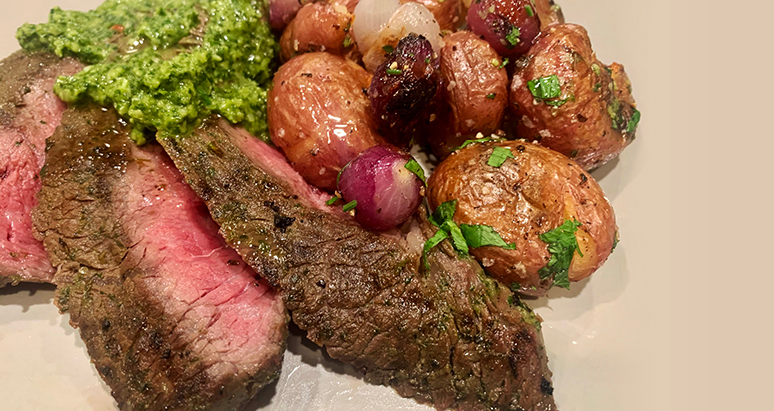 Wagyu steak is marinated in chimichurri, which is an Argentinean sauce made with parsley, oregano, shallots, red wine vinegar, and olive oil. The steak is then grilled and served with roasted red potatoes and red pearl onions. This delicious dish is full of flavor and a fresh take on steak and potatoes! Try it today!