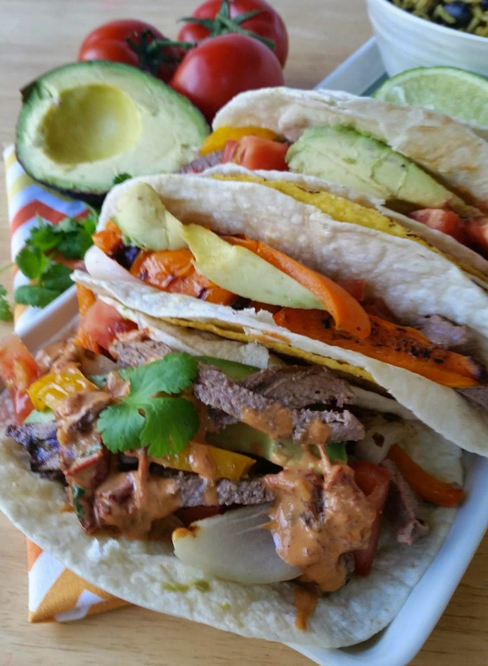 These grilled steak tacos are a full flavored, mouth sizzling, you have to have more than one kind of meal! We build our grilled steak tacos with flavorful steak, creamy avocado, fresh tomatoes, grilled peppers and onions and drizzled with homemade chipotle aioli! We serve these grilled steak tacos with a side of easy to make Spanish flavored rice!