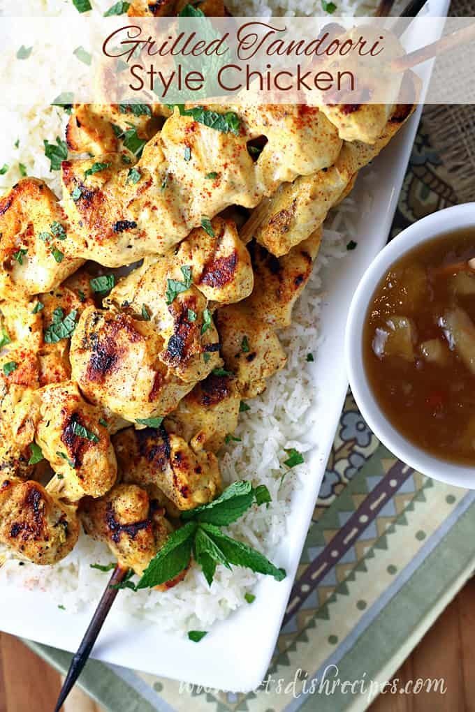 GRILLED TANDOORI STYLE CHICKEN — CHICKEN IS MARINATED IN GREEK YOGURT AND TANDOORI SPICES, THEN SKEWERED AND GRILLED TO PERFECTION IN THIS SIMPLE, EAST TO MAKE MEAL. DELICIOUS SERVED WITH MANGO CHUTNEY AND FRESH MINT!