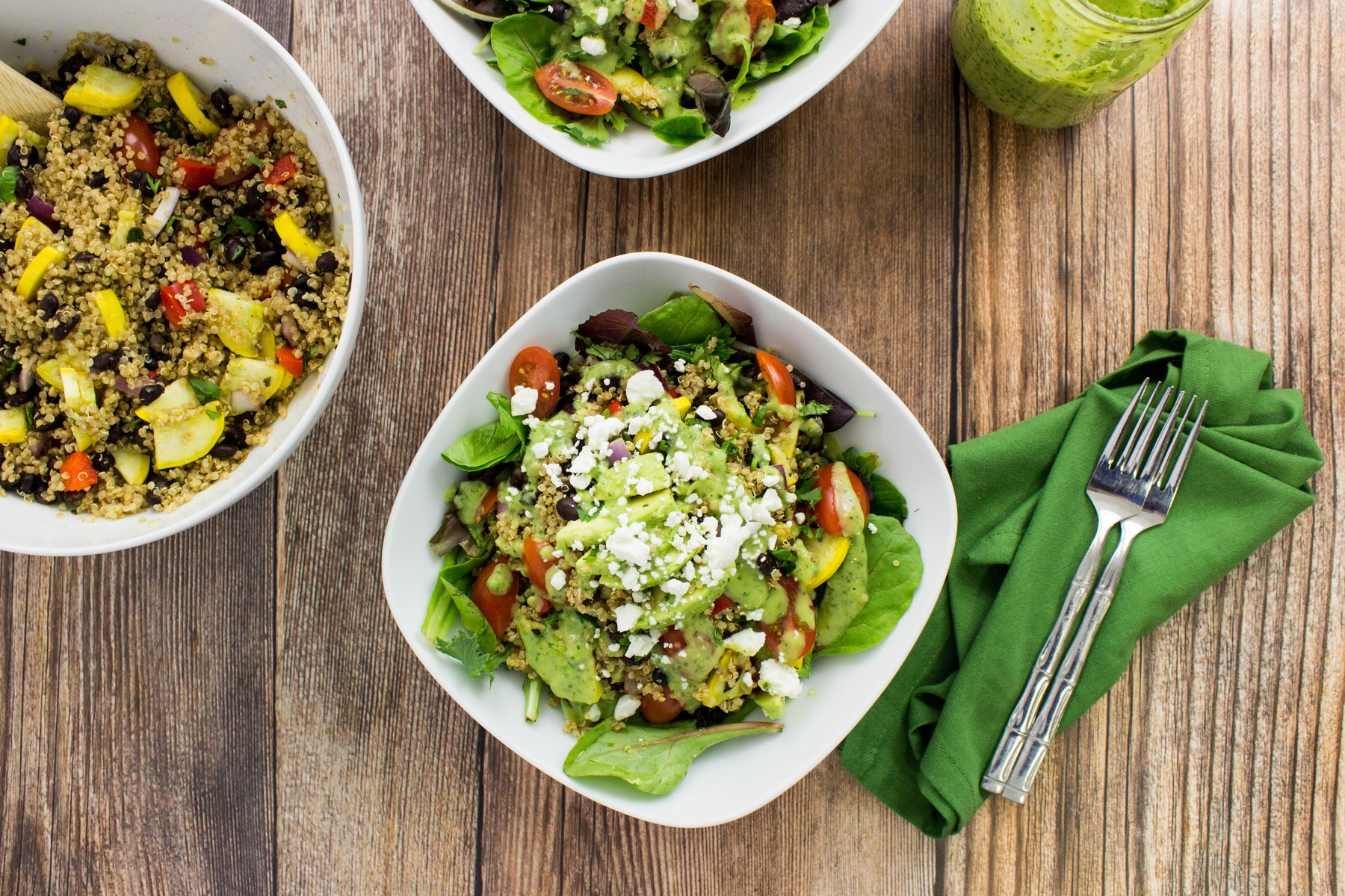 Grilled Vegetable Quinoa Salad-Light & filling meal perfect for a weekday lunch or hearty dinner! Grilled squash, bell pepper, and onion mixed with fluffy quinoa, black beans, & lettuce topped with creamy avocado dressing is a delicious bite! Weight Watchers friendly