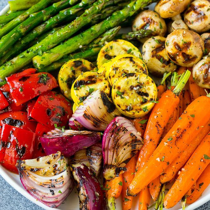 These grilled vegetables are an assortment of colorful veggies bathed in a flavorful garlic and herb marinade, then cooked to perfection on the grill. An easy dish that's quick to make and always gets rave reviews! Grilled veggies pair well with almost any protein such as beef, fish or chicken.