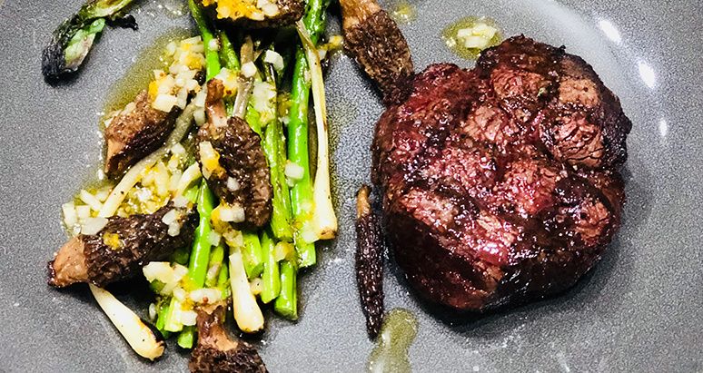 A simple and quick recipe for grilled Fullblood Wagyu beef filet mignon served with morel mushrooms, asparagus, spring onions, and Meyer lemon vinaigrette.