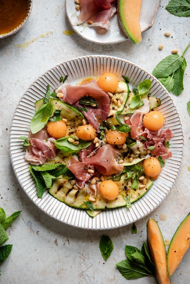 A simple Grilled Zucchini Salad made with juicy melon, prosciutto and toasted pine nuts. With a zingy vinaigrette dressing this salad is so refreshing and light and couldn't be easier to put together!