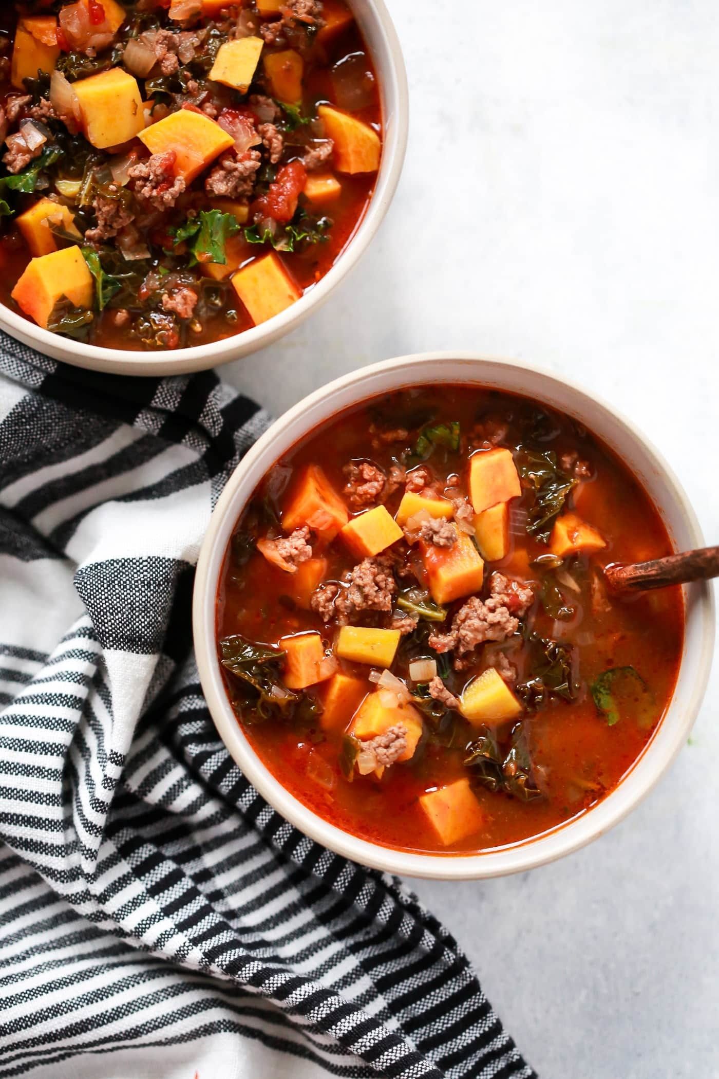 Soups Ground Beef Butternut Squash Kale Soup Olivia RibasAugust 14, 2018 46 6Check out this delicious recipe!See the full directions on my site