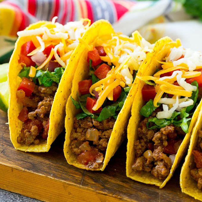 These crispy ground beef tacos are filled with seasoned meat, lettuce, cheese and tomatoes. An easy dinner recipe that the whole family will enjoy, even your pickiest eaters! Includes a recipe for ground beef taco seasoning.