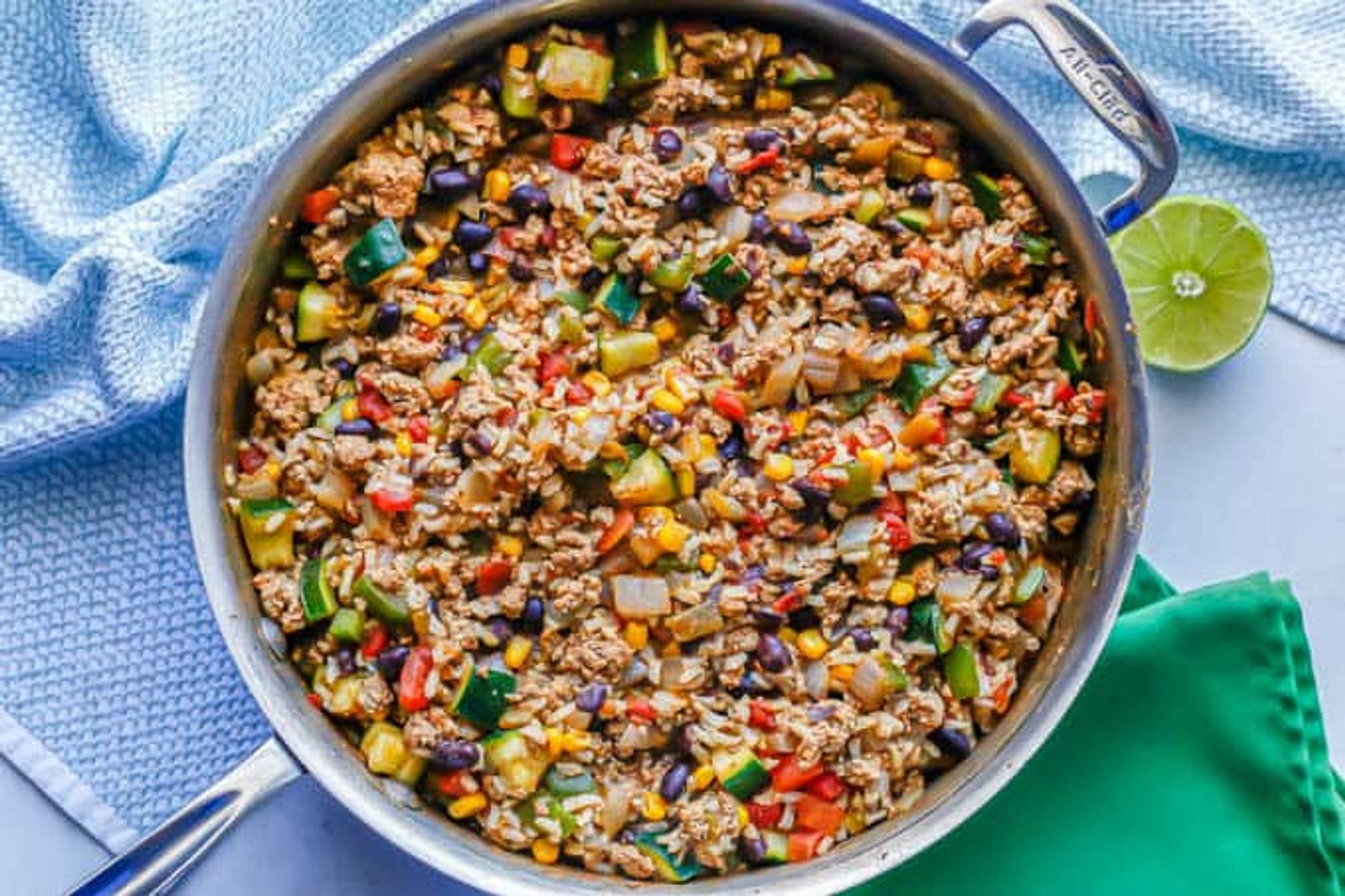 Ground turkey, rice and veggie skillet with beans, corn, tomatoes, zucchini and bell peppers is an all-in-one dinner with tons of flavor that’s ready in just 30 minutes. It’s easy to make and customize and sure to be a family favorite!