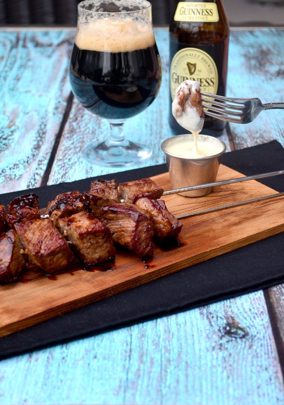 Guinness Steak Skewers with Smoked Gouda Dipping Sauce