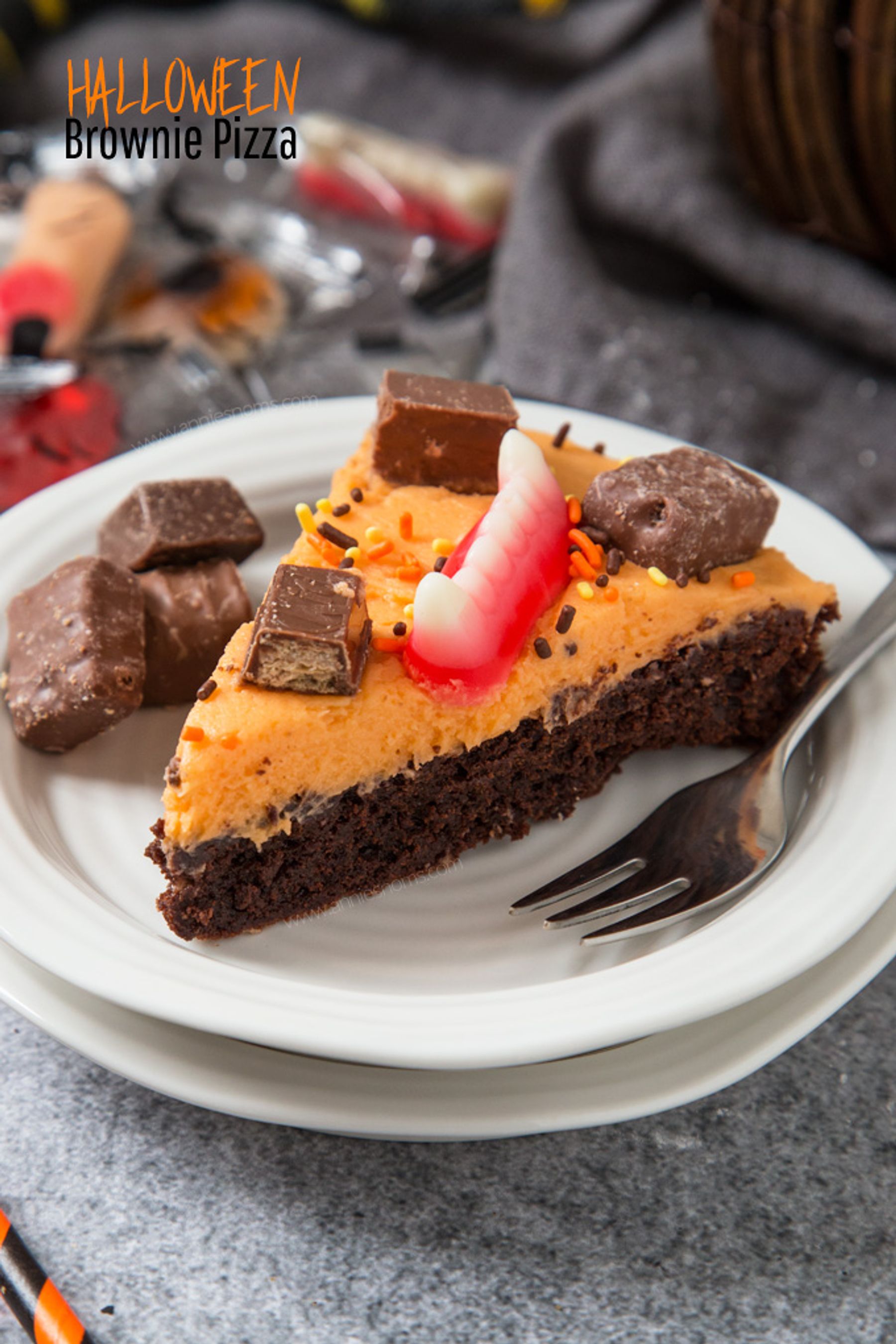 A thick and chewy brownie topped with creamy buttercream and leftover Halloween sweets. Fun to make and super delicious!