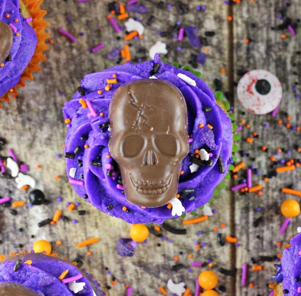 Halloween Skull Cupcakes - A yummy take on Halloween Skull Cupcakes rockin' it out with Nestlé's Butterfinger Peanut Butter Cup Skulls as the main decorative on your festive cupcakes for your Halloween Bash! Throw on some sprinkles and Devour!
