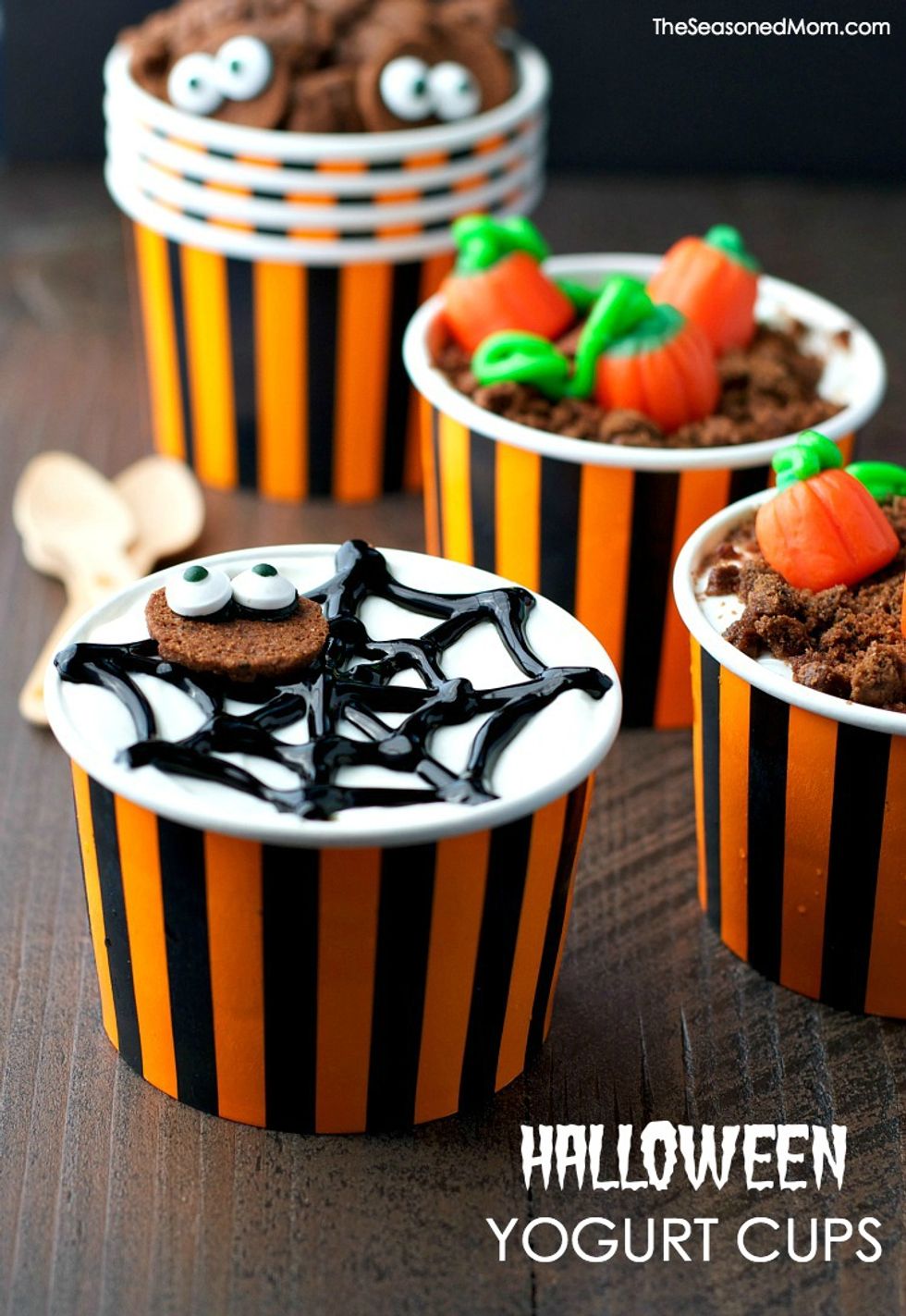 These easy Halloween Yogurt Cups are a 5-minute snack idea that the kids cannot resist! Create spooky spider webs and festive pumpkin patches that are perfect for Halloween celebrations, school parties, or other fall gatherings.