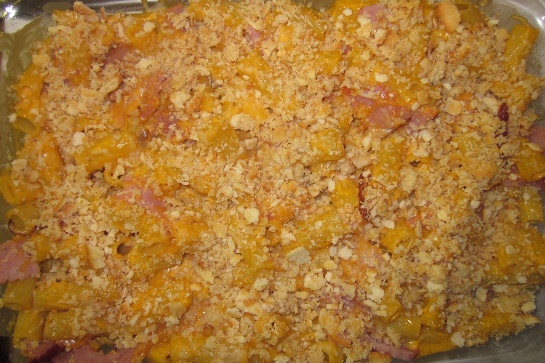 Preheat oven to 400 degrees. Spread cooked noodles over the bottom of a greased 9x13 baking dish. Pour cheese sauce over noodles, and use a rubber spatula to fold into noodles. Tear ham into strips and fold into cheese and noodles. Pour shredded cheese evenly, and use the rubber spatula to loosely fold in. In a small bowl, combine crushed crackers, Parmesan cheese, and melted butter. Sprinkle over top. Bake for 15 minutes.
