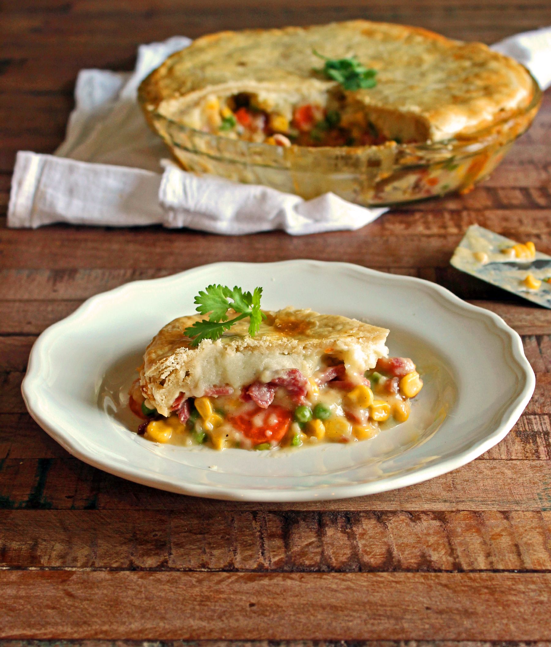 A pot pie filled with corn, peas, and fresh carrots that have been tossed in a sweet creamy sauce. Chunks of ham are mixed throughout and the pie is topped with mashed potatoes and a homemade crust. Perfect for leftovers and truly a comfort food at it’s best.