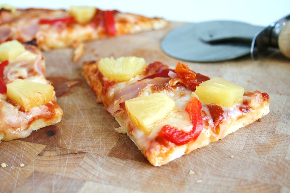 Directions: Pre-heat oven to 350 degrees F. Spread the pizza sauce atop the Naan. Next sprinkle with cheese, ham, peppers and pineapple. Place Naan pizza's on 2 baking sheets and bake until cheese is...