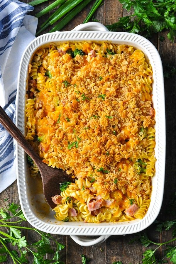 This cheesy Ham Casserole with noodles and broccoli is an easy dinner recipe to throw together on busy weeknights. Use up your leftover ham from a recent holiday, or purchase cubed ham at the grocery store — either way, your family will love this simple, hearty one dish meal!