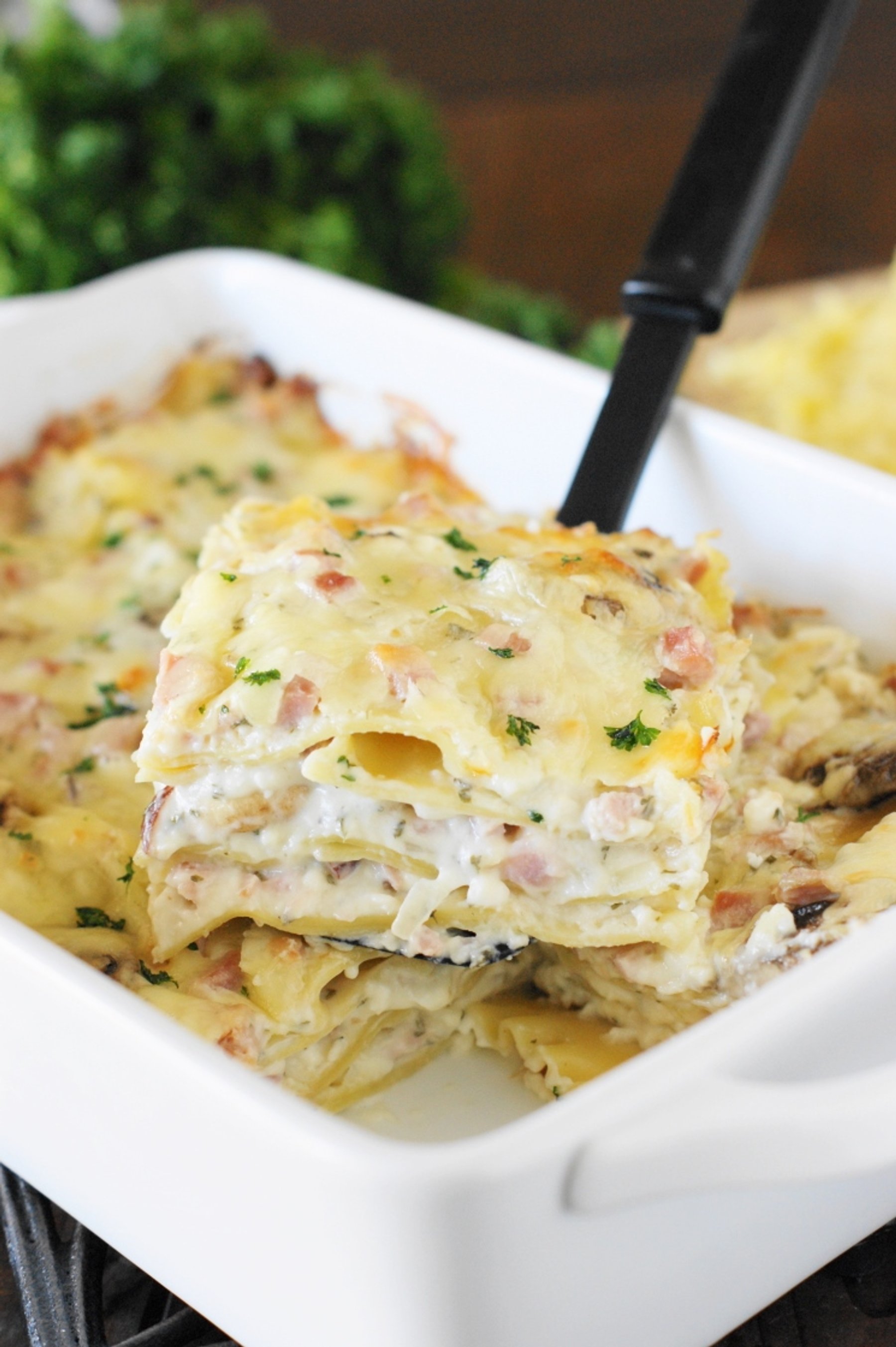 Ham & Cheese Lasagna ~ Monterey Jack white sauce with chopped ham and mushrooms make for a deliciously different twist on classic lasagna.