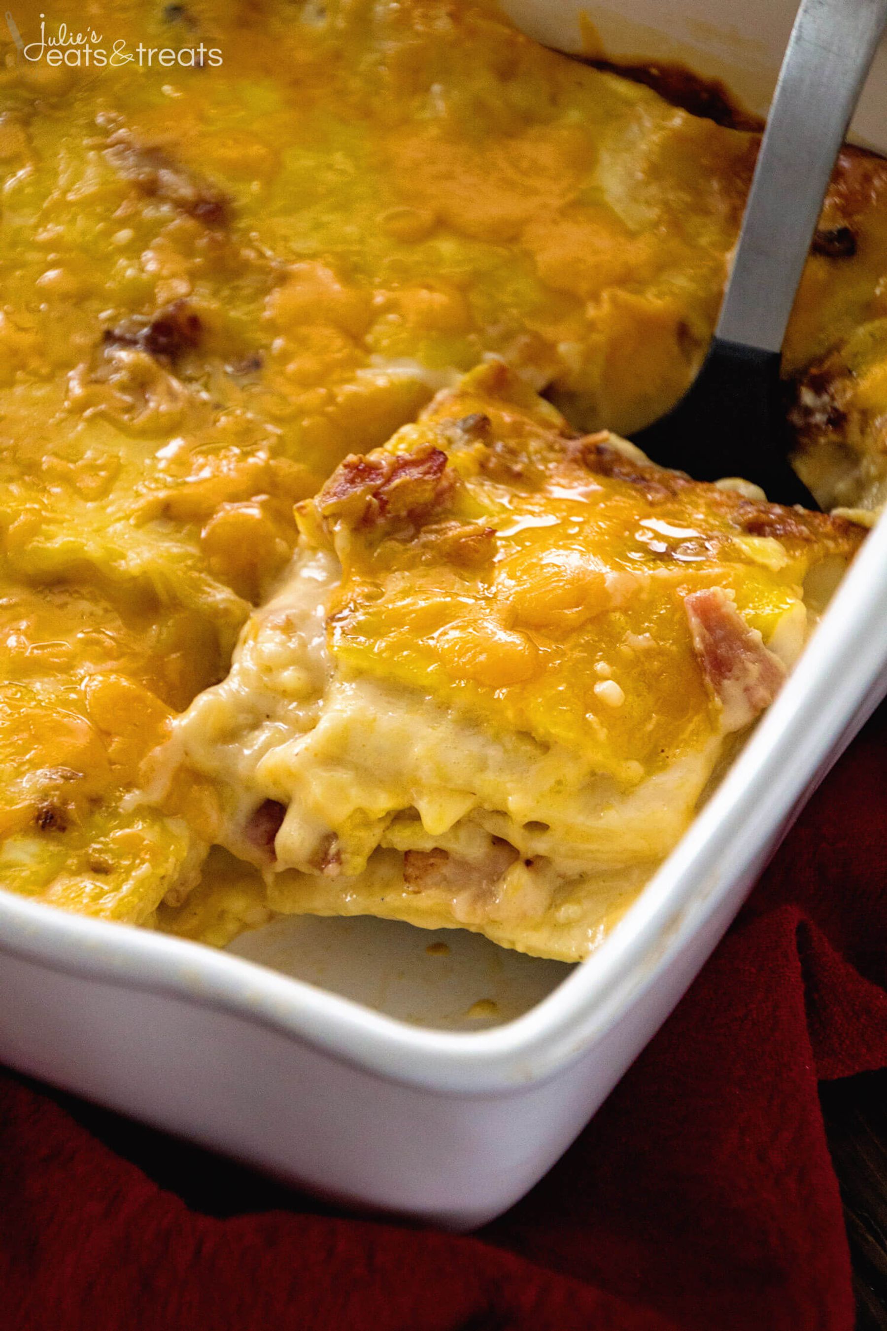 Ham & Cheese Overnight Breakfast Lasagna Recipe ~ Layers of Lasagna Noodles Stuffed with a Delicious Cheese Sauce, Bacon and More Cheese! Prep this the Night Before and Enjoy it for Breakfast or Brunch!
