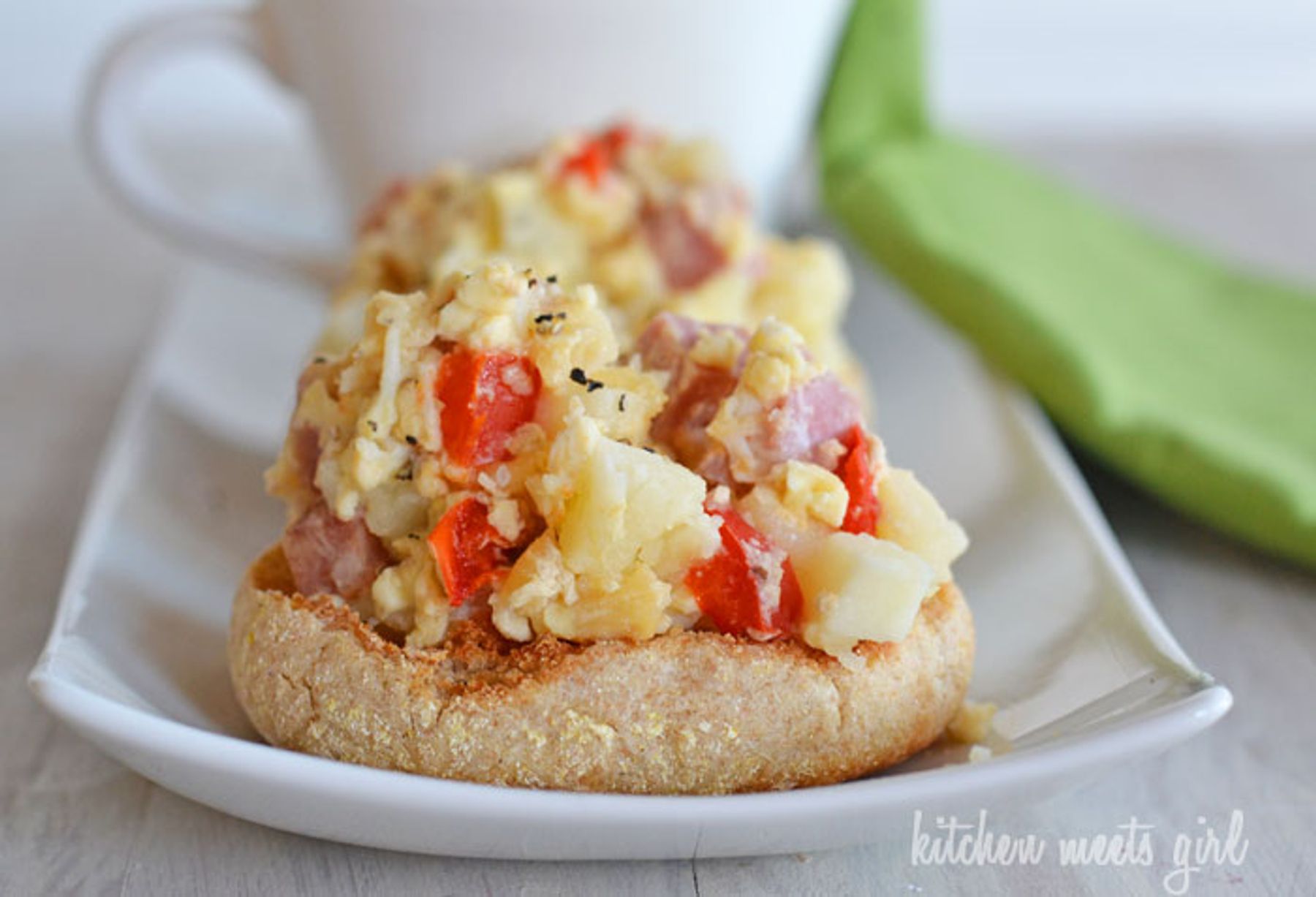 Spray the ceramic insert of a 3 1/2 to 4-quart crock pot. Combine hash browns, ham, cheese, and red pepper and place in your crock pot. In a medium bowl, stir together soup, milk, eggs, and spices. Pour...