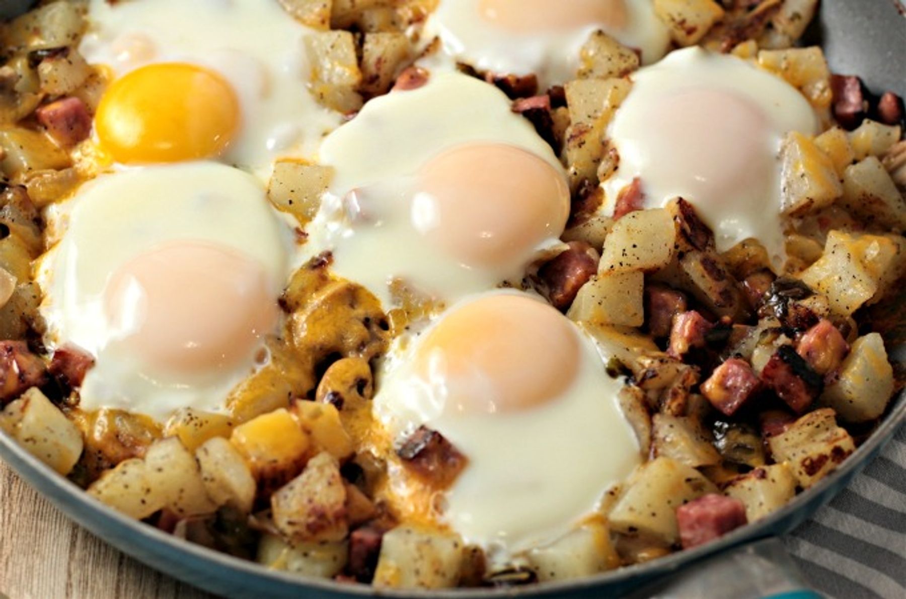 Ham Potato Skillet Breakfast features cubed potatoes and ham, green peppers, mushrooms, cheese and eggs. One pan and perfect for breakfast, lunch or dinner!