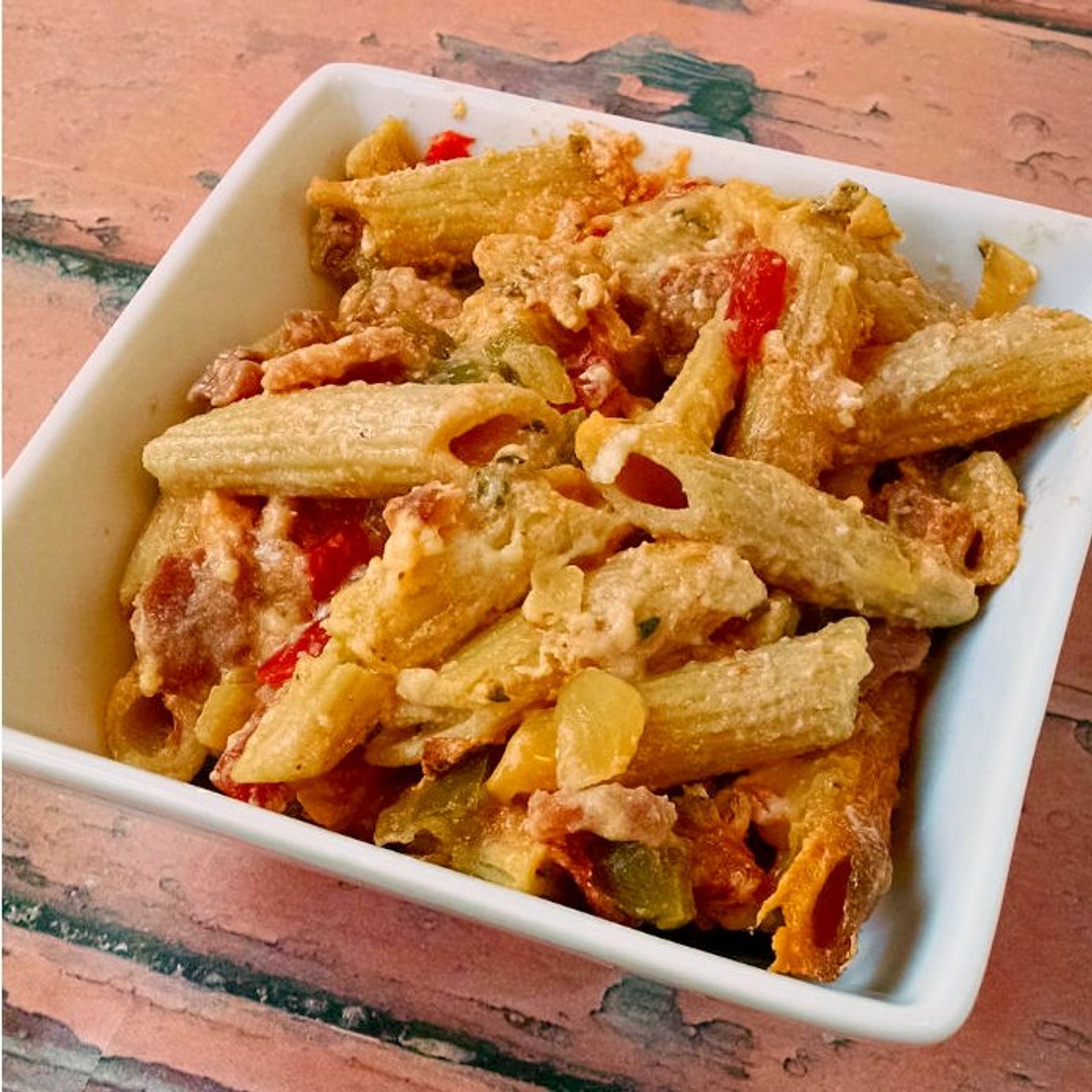 Left over ham or thick cut ham slices are combined with sweet peppers and onions then baked with pasta in a cheese sauce. This easy and tasty Ham & Veggie Pasta Bake is a freezer, pantry and fridge cleaner! Not to mention a delicious meal.