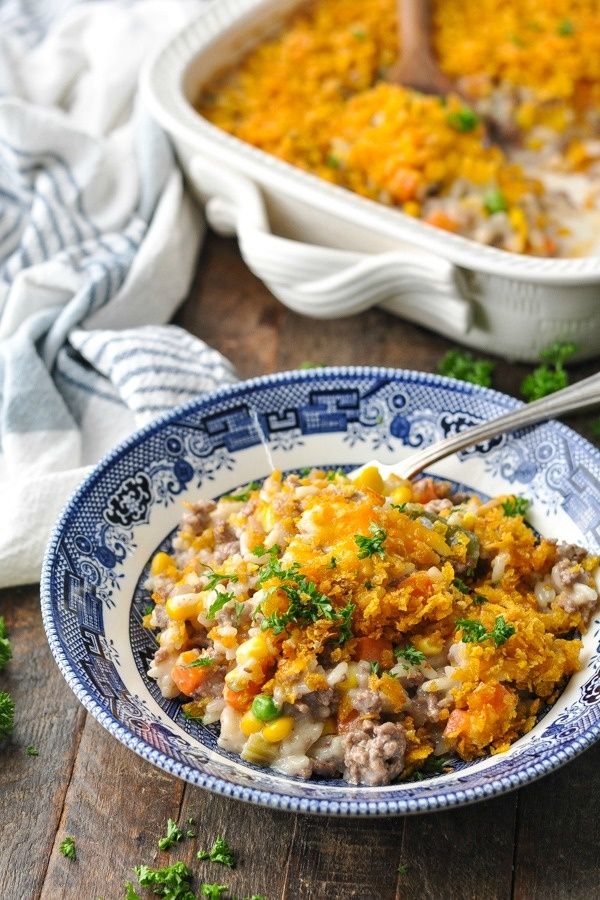 This creamy, cheesy Hamburger Casserole with Rice is an old-fashioned, easy dinner with just 15 minutes of prep! The simple ground beef recipe is an entire meal that bakes in one dish — making it perfect for busy weeknights.
