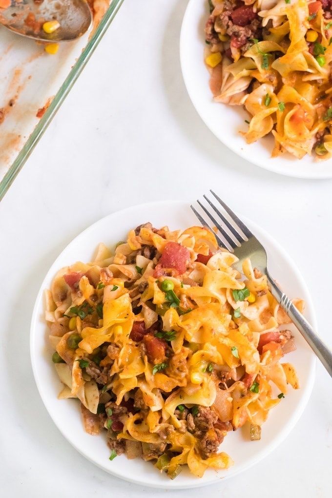 Baked with noodles, ground beef, seasonings, cheese, and vegetables, this hamburger casserole recipe is a delicious, hearty meal that is simple enough for busy nights.