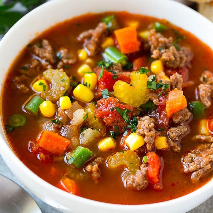 This hearty hamburger soup is loaded with potatoes and vegetables, all in a savory broth. The perfect easy dinner option that the whole family will love!