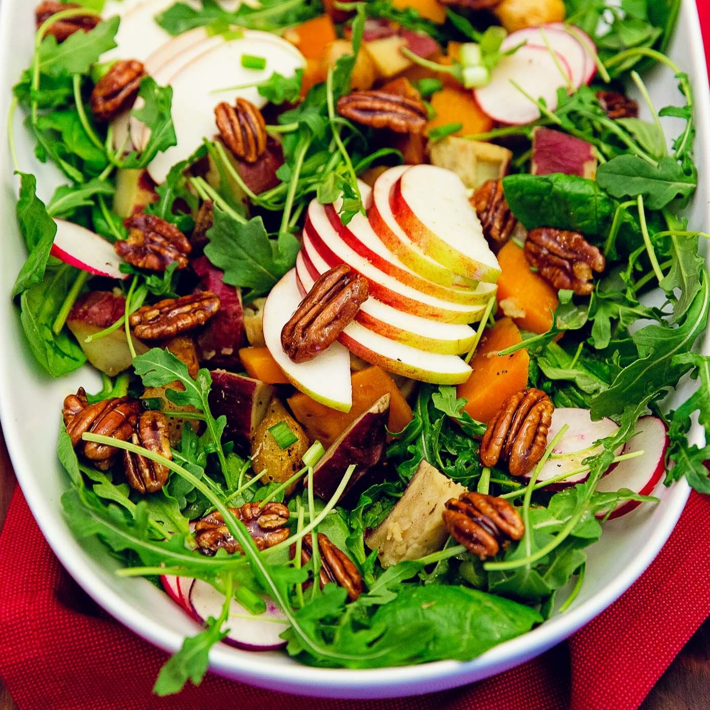 Healthy oil free Harvest Salad is visually stunning and loaded with delicious roasted root veggies, salad greens, apples, and maple pecans.