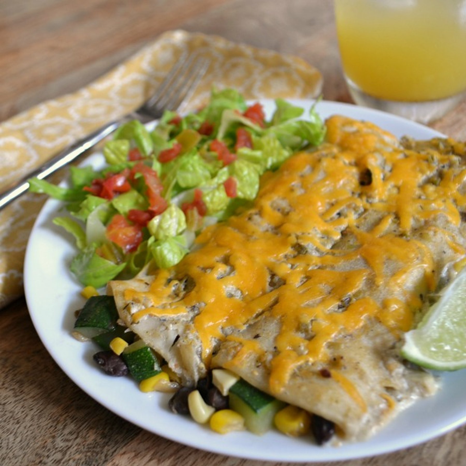 These Harvest Veggie Enchiladas are full of seasonal vegetables and baked in a delicious crema verde.