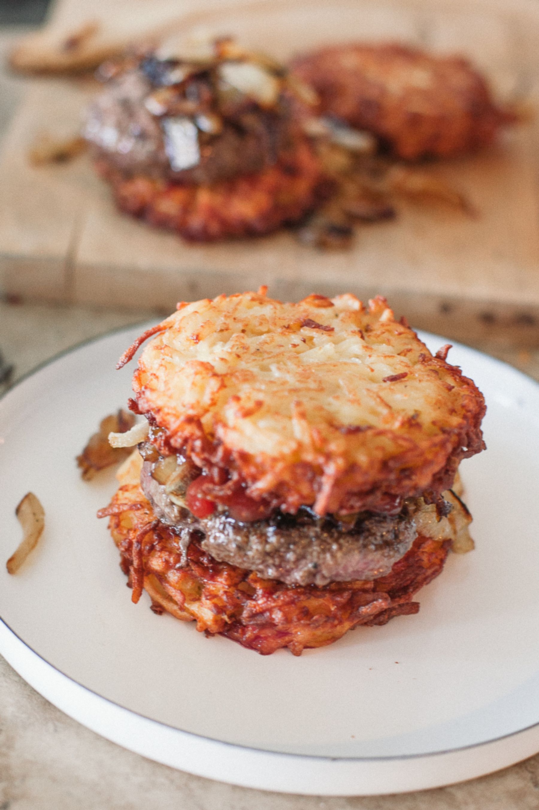 Crispy Hashbrown Burger: Ultra crispy hashbrowns wrapped around a juicy burger. Forget fries and get your potato fix wrapped about your burger patty!