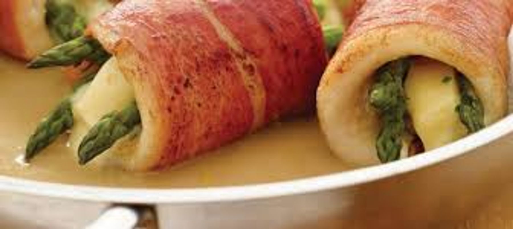 Roll up 1 stick of cheese and 3 asparagus spears in each ham/fish layer. Secure with toothpicks.