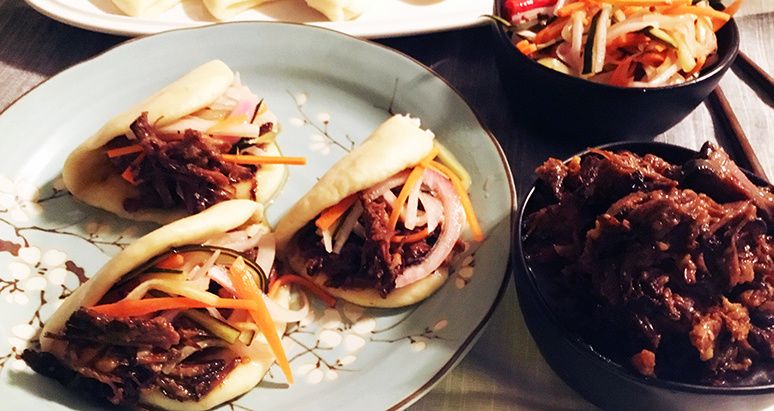 The Fullblood Wagyu beef short ribs are seared to achieve a nice caramelization and crust before being slow-cooked in a crockpot for several hours. The tenderness of the beef, allows it to easily fall apart. Serve on steamed buns and top with pickled vegetables that are marinated in pickle brine.
