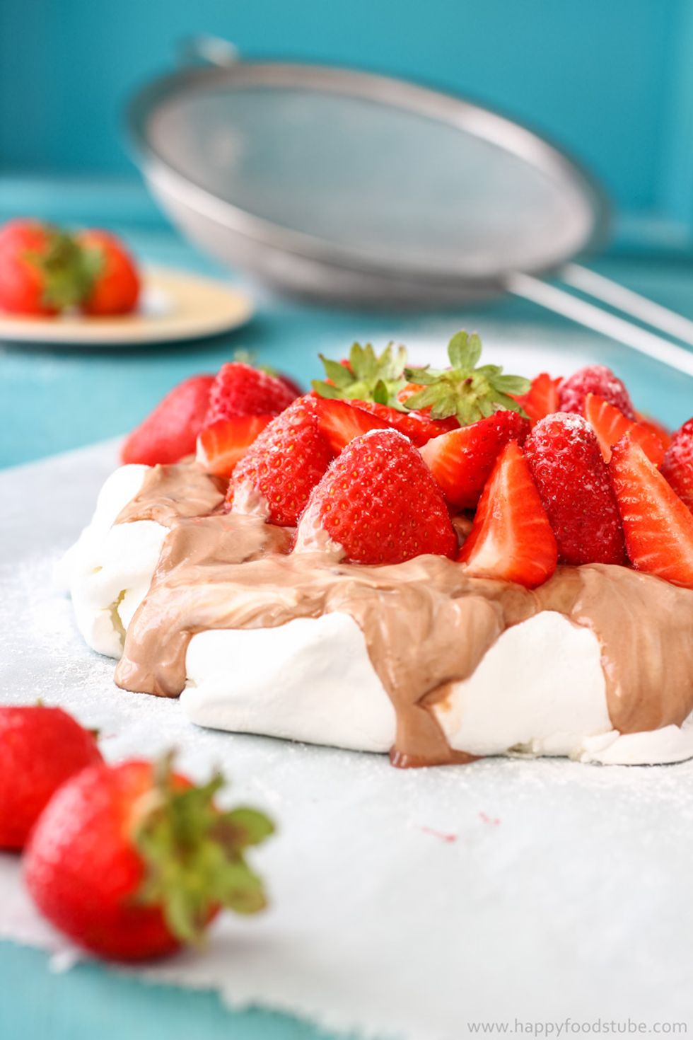 Hazelnut Pavlova with strawberries is the ultimate summer dessert. Sweet meringue shell is topped with Nutella layer & fresh strawberries!