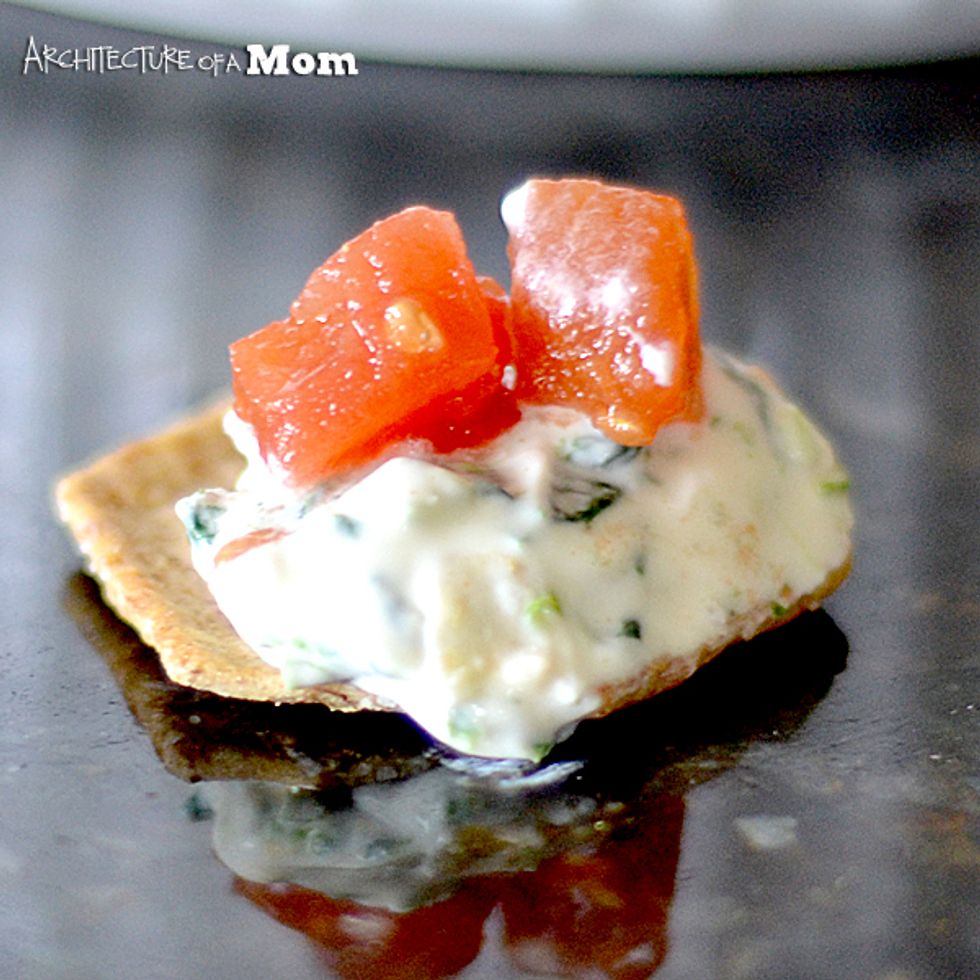 When we get together to watch football, I am looking forward to the food as much as the football. But January brings all those resolutions to eat healthier, so I am always looking for a healthy snack. I think I've found my go-to dip! This is an adaptation on the classic cold, creamy spinach dip. Who needs all that fat? Not me! This dip uses fat free sour cream, half the mayonnaise, and an extra dose of vitamins with some tomatoes!
