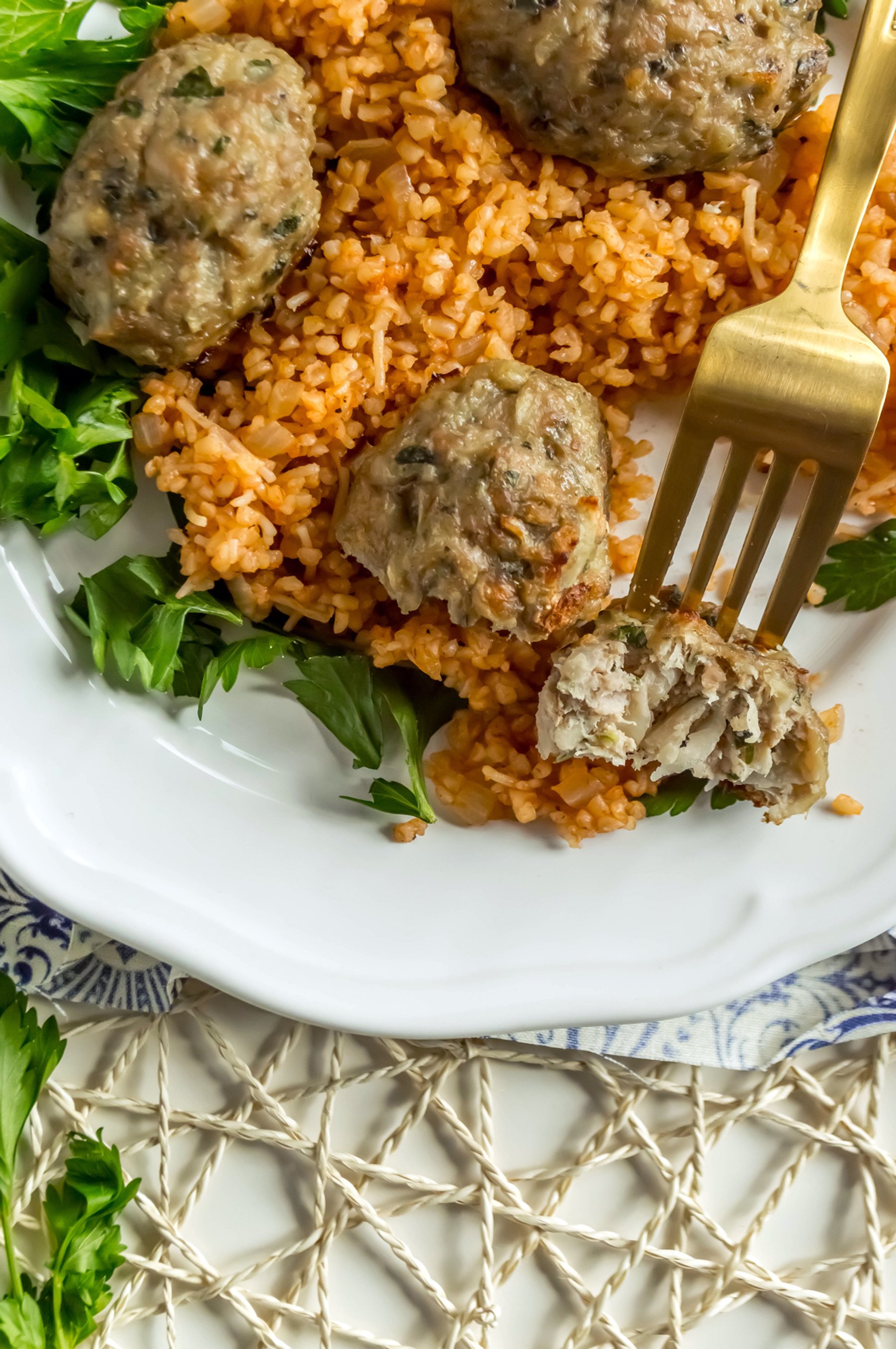 Traditional Cypriot keftedes (meatballs) are lightened up by baking instead of frying. Served with bulgur pilaf and Greek yogurt – a delicious meal that the whole family will love!