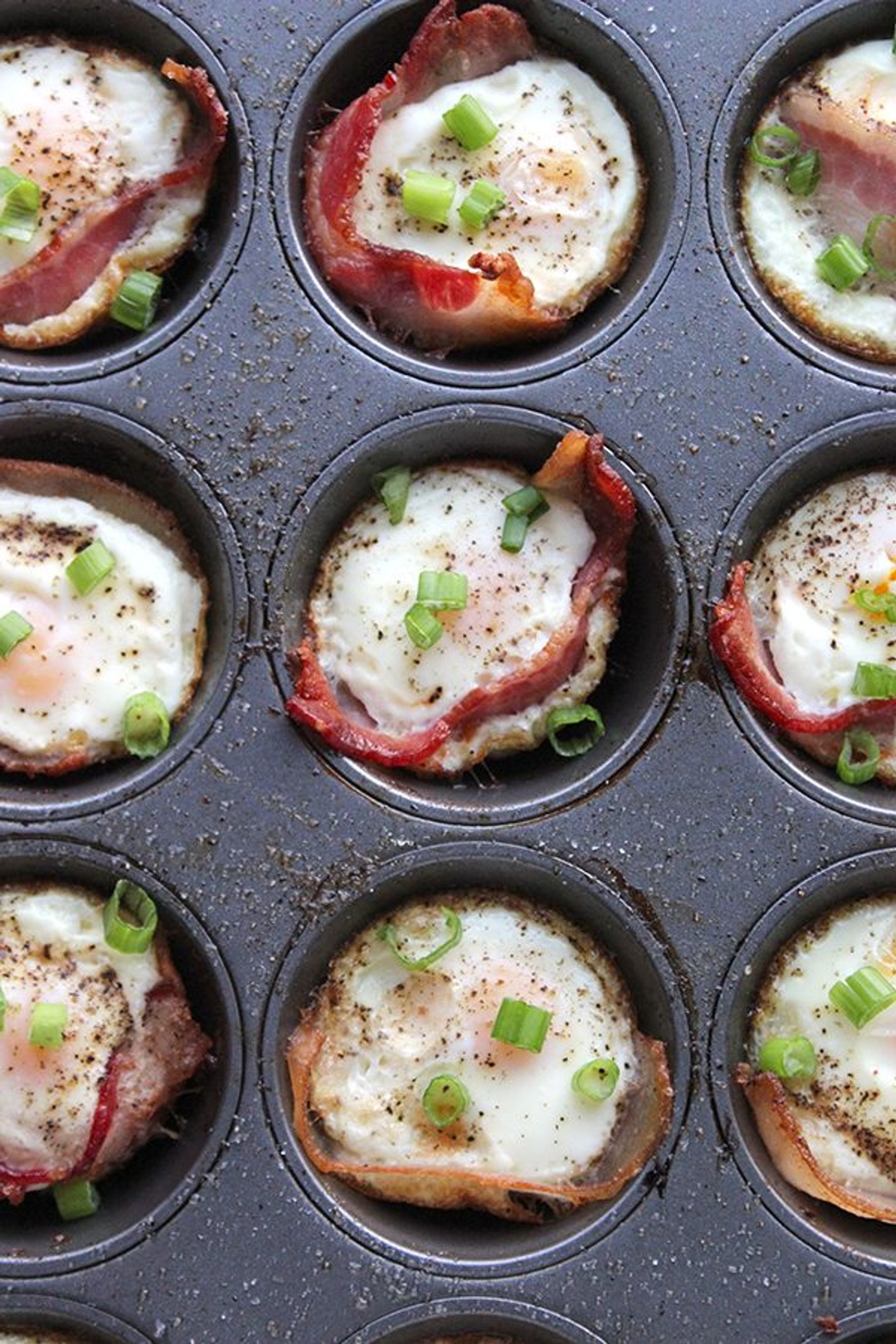 Preheat oven to 400(F) degrees and prepare a muffin pan with non-stick spray. Wrap one piece of bacon around the edge of each muffin cup then crack one egg into the middle of each.